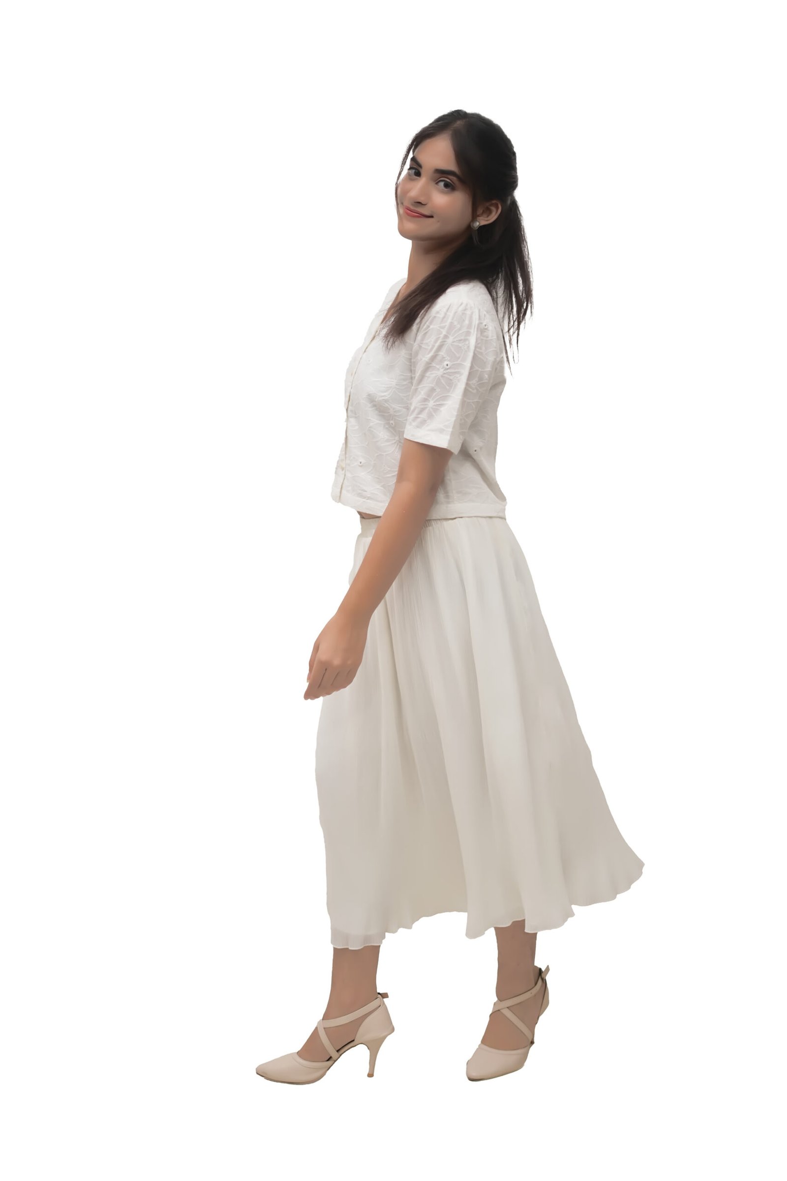 Step into effortless elegance with this soft white crinkled cotton skirt — light, breathable, and designed for everyday comfort. The flared silhouette gives a graceful flow with every step, while the elasticated waistband offers a flexible, easy fit. Perfect for both casual and semi-formal looks, it pairs beautifully with crop tops, shirts.